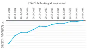 The 2020–21 campaign saw City top its group with a club record of 16 points, twice defeating Marseille and Olympiacos, and collecting four points against Porto. In the round of 16, the Blues were paired with Borussia Mönchengladbach and progressed to the quarter-finals for the fourth consecutive year after winning both legs 2–0.[82] In the quarter-finals, City were paired against another German outfit, this time Borussia Dortmund. The Blues managed to neutralize Dortmund's inform striker Erling Haaland to win the double-legged tie 4–2 on aggregate after two identical 2–1 wins home and away.[83][84] In the semi-finals, Manchester City were drawn against reigning finalists Paris Saint-Germain who'd avenged their loss to Bayern Munich in the 2020 final by knocking out the German club in their quarter-final tie on away goals. City rallied from behind to win 2–1 at the Parc des Princes thanks to goals by Kevin De Bruyne and Riyad Mahrez.[85] In the second leg, a goal in either half from Mahrez booked City's place in their first-ever European Cup final, which happened to be an all-English affair against Chelsea, with a stylish 4–1 aggregate victory.[86] The final took place at the Estádio do Dragão in Porto, Portugal, and the Citizens were defeated 1–0 by a lone goal scored by Kai Havertz in an anticlimactic game. Still, City's breakthrough marked its most successful European campaign to date.[87] As a consequence of that successful campaign, City entered the top four in the UEFA rankings, placing third.