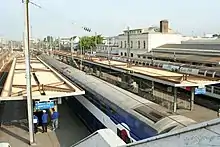 Mantes-la-Jolie is a railway station in the town Mantes-la-Jolie, Yvelines department, northwestern France. It is on the Paris to Le Havre railway at the point where the line to Caen and Cherbourg diverges. The station is planned to be the future terminus of the line E of the Réseau Express Régional (RER), on an extension from Haussmann – Saint-Lazare station in Paris.[1]
