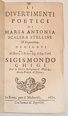 Title page of the first edition of Li divertimenti poetici by Maria Antonia Scalera Stellini, printed in Rome in 1677.