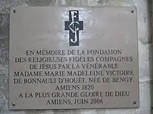 Marie-Madeleine d'Houët (1781–1858) also known as Viscountess de Bonnault d'Houet,[1] was a French widow and single mother who, later in her life, was inspired by zeal for God and guided by Ignatian spirituality to found a religious institute of Religious Sisters known as the Faithful Companions of Jesus.[2] Their goal is to work to help the poor and needy of society, and their communities have expanded around world, running schools and social service operations.