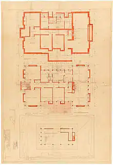 When Wright eloped to Europe with Mamah Borthwick Cheney in 1909, he offered the Studio's work to Mahony but she declined. After Wright had gone, Hermann V. von Holst, who had taken on Wright's commissions, hired Mahony with the stipulation that she would have control of the design.[17] In this capacity, Mahony was the architect for a number of commissions Wright had abandoned. Two examples were the first (unbuilt) design for Henry Ford's Dearborn mansion, Fair Lane and the Amberg House[18] in Grand Rapids, Michigan.
