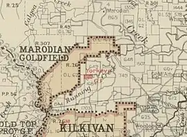 In 1867, the Marodian area was suspected of having gold due to geological similarities with other gold-bearing areas.[6] There were early finds of alluvial gold at Colo Flats and Yorkey’s Hill.[7] In 1884, the Queensland Surveyor General, A. C. Gregory, continued to promote the likelihood of gold in the Marodian area.[8] In 1901, the Marodian Gold Mining Syndicate dug a shaft down to 350 feet (110 m).[9][10][11] In 1902, interest in the goldfield was still low with 109 people on the goldfield compared with over 14,000 on the Gympie goldfields.[12] In 1903, the Marodian Gold Mining Company established a mining lease of 40 acres (16 ha),[13] but operations had ceased by 1904.[14]