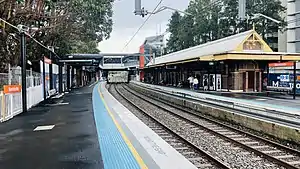 Platform 1 has an asphalt surface with the original brick face and edge. The northern side of this platform (not used and fenced off) has a brick edge with the original brick face. Platform 2 also has its original brick face but with a concrete edge.[2] Both platforms are approximately 160 metres long, enough to fit an 8 carriage suburban train. Both platforms are slightly curved and are equipped with LCD screens displaying next trains, together with automated announcements. Due to the lack of shelter at the eastern end of both platforms, there are no screens at this end. There are two small waiting shelters around the middle of platform 1, to encourage waiting passengers to spread out when it is raining, as all the station buildings are at the western end of the platform.