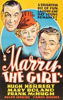 Marry the Girl is a 1937 American romantic comedy film directed by William C. McGann. The 68 minute film, set at a newspaper syndicate, was written by Sig Herzig and Pat C. Flick, shot by cinematographer Arthur L. Todd, and was produced by Bryan Foy and Jack L. Warner under the Warner Bros. banner.[1]