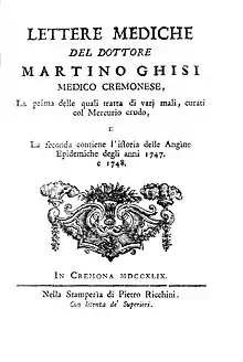 Ghisi was born in Soresina and studied medicine under Paolo Valcarenghi. After his studies in Florence at the Santa Maria Nuova hospital where he studied under Antonio Cocchi (1695-1758), Giuseppe Maria Saverio Bertini (1695-1756), and Angelo Nannoni (1715-1790), he returned to Cremona where he practiced. In 1745 he studied diseases of livestock and wrote a report to Francesco Roncalli Parolino (1692-1769) who published it in 1747. In 1749 he reported on malignant angina, in fact diphtheria, comparing it with livestock diseases. Ghisi described the climate and conditions when the epidemic occurred and then described paralysis of the velum palatinum and the tumefaction of the submaxillary glands. He also examined changes in the bronchi, pulmonary edema and the strain it caused to the right side of the heart. Ghisi called the pharyngeal form of diphtheria as Angina strepitosa perfida mortalis and compared it with the tracheal form. He noted that in children, there was tube-shaped false membrane in the trachea that was coughed up.[1] This was published in his only published work - Lettere mediche del Dottor M. Ghisi which also included a section on the use of mercury for treatments.[2][3][4]