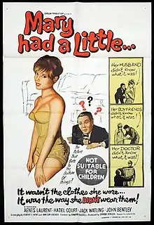 Mary Had a Little... is a 1961 British comedy film directed by Edward Buzzell and starring Agnès Laurent, Hazel Court and Jack Watling.[2] It takes its title from the nursery rhyme Mary Had a Little Lamb and is about a slick impresario who tries unsuccessfully to win a bet with a psychiatrist over the production of a perfect baby via hypnotism.[3] It was shot at Walton Studios near London with sets designed by the art director John Blezard.