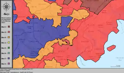 Maryland is divided into eight congressional districts, each represented by a member of the United States House of Representatives. After the 2020 census, the number of Maryland's seats remained unchanged, giving evidence of stable population growth relative to the United States at large.[1][2]
