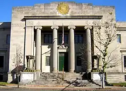 The imposing main entrance is set on a high basement of regular ashlar blocks, with a flat roof hidden by a shaped parapet. Dominating the facade is a projecting pavilion composed of four giant Ionic columns in antis supporting an architrave replete with Masonic symbols.[2] A large cascade of steps leading up to the main entrance is flanked by metal tripod tables each on a base decorated with a griffin on a terracotta plaque. The main lobby was remarkable for its Egyptian styling, featuring battered entranceways, papyrus ornaments and sphinxes. This lead via two sets of doors to the large Main Lodge room, which was used for Rural Lodge meetings and other large events, and featured neoclassical furniture and furnishings and a classical landscape fresco signed by the artist, Carroll Bill.