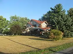Maurice W. Manche Farmstead is a historic home and farm and national historic district located in Ripley Township, Rush County, Indiana. The farmhouse was built in 1919, and is large two-story, Bungalow / American Craftsman style dwelling faced in brown brick, stucco and half-timbering. It has a low pitched roof with red ceramic tile features a connected long porte cochere and porch. Also on the property are the contributing gambrel roofed livestock barn, corn crib, windmill, scale shed, and fence.[2]:5