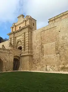 Mdina Gate (Maltese: Il-Bieb tal-Imdina), also known as the Main Gate or the Vilhena Gate, is the main gate into the fortified city of Mdina, Malta. It was built in the Baroque style in 1724 to designs of Charles François de Mondion, during the magistracy of Grand Master António Manoel de Vilhena.