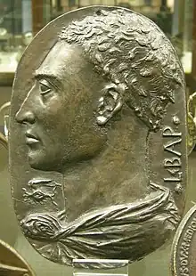 It has been suggested that Leon Battista Alberti may have played a significant role in Pisanello's conception of the medal of John.[25] Alberti attended the Council in Ferrara as a member of the papal Curia and could therefore have encountered Pisanello. Between 1430 and 1435, Alberti cast a bronze, self-portrait plaque in a style that was clearly influenced by Roman imperial portraits. Alberti's plaque was the first labeled self-portrait of an artist.[26]
