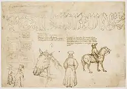 Some notable drawings and sketches are associated with Pisanello's medal. One is a highly finished pen drawing of a saddled and harnessed horse from the front and the back (The Louvre, Vallardi, 2468, fol. 277). The horse from the back is clearly the same horse as that of the emperor's squire on the reverse of the medal. The horse is very likely to have come from a Byzantine stable because of its slit nostrils. It was believed in some oriental countries that slitting the nostrils of horses enabled them to breathe easier under exertion.[17] A similarly maltreated horse is depicted in the centre of the Paris sheet of sketches of John and members of his retinue.