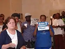 While advocates of a public option agree with single-payer proponents that the United States should provide universal health care, they disagree on the solution, asserting that Americans are not interested in a government-run health care system and want to be able to keep their private health insurance.[58] Critics who support single-payer instead charge that offering a public option to compete with private insurance would create a two-tiered system of concierge versus minimal medical services, as private for-profit insurance companies use political muscle to deny coverage to the oldest and sickest Americans, thus shunting the more expensive patients onto a financially vulnerable public option.[59] Medicare for All proponents also say a hybrid system of private insurance coupled with a public option would result in added bureaucracy and paperwork, and therefore fail to lower health care costs.[60]