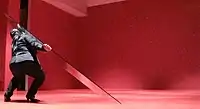 In Suryodarmo's 2003 piece Alé Lino, she spends three hours leaning into a 4 m (13 ft) pole resting on her solar plexus. Inspired by her research into the Bissu, an androgynous gender of the Bugis people, Alé Lino is an exploration of the "physicality of emptiness".[15]