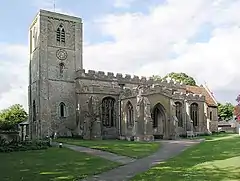 The parish church, dedicated to the Holy Trinity since 1443, consists of a chancel, aisled nave with south porch, and a west tower housing eight bells. More peals have been rung at Holy Trinity than any other church.[7] The chancel is unusually long and dates from the 12th century, perhaps indicating the existence of an earlier minster on the site. The tower dates from the late 12th century, with the top stage added in the late 13th century.[4]