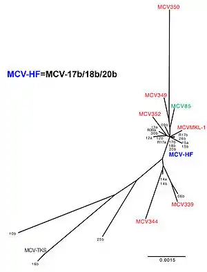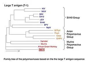 MCV is genetically most closely related to the African green monkey lymphotropic polyomavirus[1] (formerly known as African green monkey lymphotropic papovavirus),[14] which is consistent with MCV coevolving with human primates.