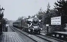 In May 1905, the London and South Western Railway's (LSWR) board approved the expenditure of £167 on the construction of a halt comprising two short wooden platforms and huts in a cutting on the South West Main Line.[1] Situated 55 chains (1.1 km) to the west of Bournemouth Central, the halt lay between the Central and West stations at a point halfway between Gasworks Junction and Central.[2][1] It was connected to the lower end of Meyrick Park Crescent in Bournemouth by two flights of steps.[1] The new station would serve the expanding suburb of Winton and Meyrick Park, an area of open space where an extensive golf links had been laid out.[1] The decision to provide the halt followed the recommendation of the LSWR's General Manager, Sir Charles Owens, in February 1905 to meet competition by trams in the Bournemouth area by introducing two steam rail motors which would supplement the existing local service.[3] Around ten irregular-interval journeys were to be made between Bournemouth West and Christchurch, with certain services extended to New Milton and Ringwood.[1][4] The station's opening coincided with the introduction of the service on 1 March 1906.[5][6]