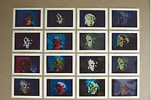 Digital Andy, photographic prints, 30x40cm each, 16 pieces. Recorded Warhol footage, distorted by unintended use of correction tools like Drop-out Compensators and Time Base Correctors, again photographed and printed