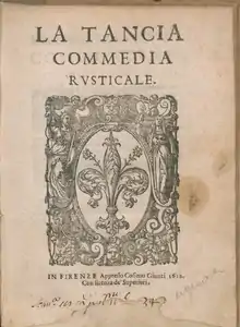 In 1612, Buonarroti began construction of a gallery (now the Casa Buonarroti) on the Via Ghibellino dedicated to his famous relative and commissioned numerous artists to paint murals, including Artemisia Gentileschi[1] (WP Commons gallery). During this period his name became linked with Francesca Caccini, who composed the music for La Tancia, the Balletto and La Fiera.