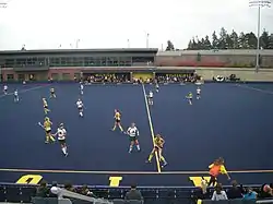 Field hockey has been a varsity sport at Michigan State University since 1972.[2] The Spartans have competed as a member of the Big Ten Conference from 1981 to 1988 and again since 1992. From 1989 to 1991, Michigan State played in the Midwestern Collegiate Field Hockey Conference (MCFHC).[3] Although the Spartans had never won a Big Ten championship (either in the regular-season or the tournament) or appeared in the NCAA tournament before 2001, they have found considerable success in the 21st century under the guidance of head coaches Michele Madison (1993–2005), Rolf van de Kerkhof (2006–10), and Helen Knull (2011–present).[2][3] In the new millennium, Michigan State has won four Big Ten regular-season championships (2001, 2003, 2004, and 2009), four Big Ten tournament titles (2002, 2003, 2009, and 2013), and has qualified for the NCAA tournament nine times (2001, 2002, 2003, 2004, 2007, 2008, 2009, 2010, and 2013).[3][4][5] The Spartans have advanced to the NCAA semifinals twice, in 2002 and 2004.[3][4]