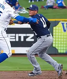 After the 2012 season, Rojas became a free agent and signed with the Los Angeles Dodgers organization.[1] He spent the 2013 season with the Chattanooga Lookouts of the Double–A Southern League, where he hit .233 in 130 games.[2] In 2014, he received a non-roster invite to Major League spring training, where he was given a chance to compete for the vacant second base job.[3][4] The Dodgers assigned him to the Triple–A Albuquerque Isotopes to start 2014, where he hit .302 in 51 games.[2]