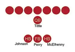 The 49ers in the 1950s used the T formation, sometimes referred to as a full house backfield, which deployed a quarterback, fullback, and two halfbacks. Such a formation was common at the time at both the college and professional levels, as teams sought to emulate the success the Chicago Bears had with the formation over the previous decade.[6] The Million Dollar Backfield began its construction in 1948 with the team's signing of speedy fullback Joe Perry. In 1951 the 49ers drafted quarterback Y. A. Tittle. Tittle had played the previous three seasons with the Baltimore Colts, and became available in that year's draft after the Colts folded. The next year the 49ers drafted halfback Hugh McElhenny in the first round. McElhenny proved to be an explosive play-maker and was recognized as the NFL's rookie of the year in 1952.[7] All three were invited to play in the Pro Bowl for 1953, comprising the starting offensive backfield for the West.[8] The final piece came in 1954, when John Henry Johnson joined the team. Johnson became known for his powerful running and his blocking,[9] which served to complement the finesse of Perry and McElhenny.[10]