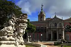 The Palace is composed by an architectural complex which includes a church, a convent and a royal palace, built between 1743 and 1752. This palace is an example of the joanine baroque architecture, with a visible Italian influence which characterized the architectural production under royal patronage, during the joanine period. The Palace has a complex blueprint, which is the natural consequence of the articulation of the distinct bodies which form the palace, and is spread around two square patios.[7]