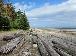 Miracle Beach Park comprises 137 hectares (340 acres), with approximately 665 m (2,182 ft) of shoreline along the Strait of Georgia on the east coast of Vancouver Island. The beach component of the park extends outward approximately 340 to 410 m (1,115 to 1,345 ft) from the shoreline to the tide's low water mark. The tide floods this sandy foreshore area twice daily. The extensive beach area is an intertidal sandbar, the result of coastal sediment transport from Williams Beach, and other nearby shorelines, driven by winds and waves from the southeast, as well as sediment from spilling out from Black Creek and Oyster River. Following this sediment transport pattern, the sands of Miracle Beach are being transported northward to Saratoga Beach. The shoreline is composed of a cobble and gravel surface with driftwood logs. Native species growing in the saline environment of the shoreline include gumweed, American dunegrass, Vancouver wildrye. The intertidal area is heavily trafficked by park visitors but animal life that can be found there include sand dollar, purple shore crab, green shore crab and green burrowing anemone. Coho Salmon swim up Black Creek from the sea in the fall.[13]
