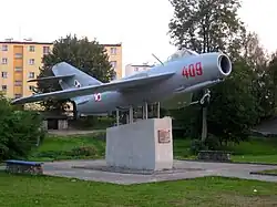 • Similarly to the one in Wołów, one of the fighter jets that Hermaszewski flew on is used as a monument in Miastko. It was gifted to the town by the cosmonaut in 1989 and unveiled on the 50th anniversary of the outbreak of World War II; the text on its plaque reads: "To the glory of Polish wings on the 50th anniversary of the outbreak of the Second World War – citizens of Miastko".[49]