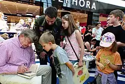 During their training and after their joint mission to the Salyut 6 orbital station, Pyotr Klimuk and Mirosław Hermaszewski befriended each other – they stayed in touch and remained close friends ever since.[38] Mirosław also befriended numerous other persons associated with the Soviet space programme during his time in Russia and Kazakhstan, including members of Yuri Gagarin's family and Alexei Leonov.[4] Hermaszewski continued to express gratitude for being given the opportunity to see the cosmos firsthand and recalled it very fondly, admitting that he missed it and still dreamed about the experience often.[39] He regularly visited schools and spoke with children of all ages, as well as attending interviews with various media outlets; he has been described as a "modest and likeable person".[40] Hermaszewski said he had an "aesthetic experience" that transformed into a "spiritual experience" while aboard the Soyuz 30 in space, but he viewed faith and religion as an intimate and private matter.[41][42]