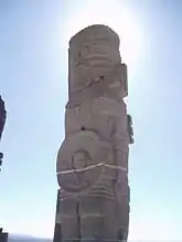 The atlante columns at Tula have representations of mirrors sculpted on their backs with four smoking serpents, one in each quadrant.[51] The faces of the mirror are replaced with human faces on all of them, corresponding to the close association between faces and mirrors across Mesoamerica.[71]