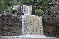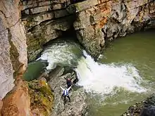 At certain points along the canyon lie small lakes, connected to each other by waterfalls, high up to 21 m. There are located in total 12 waterfalls and 16 lakes. They vary in shape and size according to their position, and the structure and lithological composition of the limestone blocks. The canyon is at its widest at the final lake, while the narrowest part is in the area of the fourth lake, where it is also deepest, between cliffs 200 m high.[4][5]