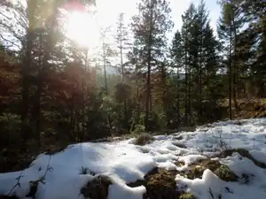 The Mission Creek Greenway is a linear park extending along the creek from the shores of Okanagan Lake to Mission Creek Falls. Geological features along the trail are numerous and diverse, including; Layer Cake Hill, the Pinnacle, the White Lake Formation, hoodoos, exposures of ancient river systems and gigantic boulders dropped by the Fraser Glacier.[5]