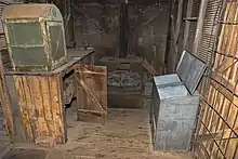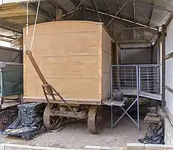It consists of a carriage of four steel wheels with a drawbar for towing. The drawbar was attached to the back of a Roden or McClaren traction engine. On top of the carriage a rectangular cabin was fitted with two single full-length doors and a small window at one end. The kitchen contains a coal stove for cooking, a wooden cupboard for storage (below) and food preparation (above). Elsewhere in the kitchen are a number of wooden packing cases, food bins, cooking and eating utensils, fire tools and pitching forks.[1]