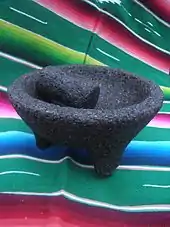 A molcajete ([molkaˈxete]; Mexican Spanish, from Nahuatl molcaxitl) and tejolote (from Nahuatl texolotl) are stone tools, the traditional Mexican version of the mortar and pestle,[1][2] similar to the South American batan, used for grinding various food products.