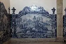 Within the monastery are ceramic tiles formed into panels that depict several different scenes. The ceramic tiles that were created are called azulejo. The tiles were created and painted for the monastery during two separate periods established by Santos Simoes. The first period was from 1700 until 1725 and was called the "great painting period," during King Joao V's reign. The second period was called "the great production period," which lasted from 1725 until 1755. The scenes range from life in the countryside, hunting, and even noble amusement. In total, there are over 150 different panels and scenes within the monastery. [2]