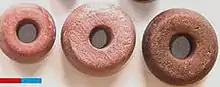 Ovruch slate spindle whorl - spindle whorl, carved out of pink and red slate stone (pyrophyllite slate), which was mined in the territory of present-day Ukraine, near the town of Ovruch in the 10th - 13th centuries. Ovruch masters diligently repeated the most successful form of a clay spindle whorl - biconical (the weight as if consisted of two truncated cones connected by broad bases) The spindle whorl weighed on average about 16 g, the height was from 4 to 12 mm, the outer diameter was from 10 to 25 mm, the diameter of the hole for the spindle was 6–10 mm. If the spindle whorl turned out to be too narrow, it was wrapped with a thread so that it would not slip during rotation. Slate - soft stone; on the samples found by archaeologists, there are still scuffs from the threads.[13] The production of slate spindles in Ovruch was designed for wide sales. The merchants who bought the consignment of the spindle whorls made a considerable way with them, sold them in different lands. Ovruch spindle whorls are found by archaeologists not only in the territories of Kievan Rus', but in other regions. Production of spindle whorls was designed for a wide sale.[14] According to A. V. Artsikhovsky, "they are exactly the same in Kiev and Vladimir, in Novgorod and Ryazan, even in Cherson, in the Crimea and in the Bulgaria on the Volga." The Ovruch spindle whorls were so valued that the owners carved their personal tags on them, and after the spread of writing - carved their names. In the 13th century, the stone spindle whorls become clay again: the Tatar-Mongol invaders destroyed Ovruch workshops.[15]
