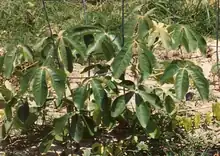 The mongongo tree, mongongo nut or manketti tree (Schinziophyton rautanenii) is a member of the family Euphorbiaceae and of the monotypic genus Schinziophyton. A large, spreading tree, the mongongo reaches 15–20 metres tall. It is found on wooded hills and among sand dunes, and is associated with the Kalahari sand soil-types. The leaves are a distinctive hand-shape, and the pale yellow wood is similar in characteristics to balsa, being both lightweight and strong. The yellowish flowers occur in slender, loose sprays.