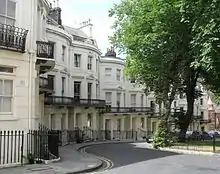 This long, tall terrace of houses blocked the view of the South Downs that Montpelier Crescent had when it was first built.[6] Along with the crescent, it forms "a townscape of outstanding quality".[68] Only the west side of the road has houses, as the open space outside Montpelier Crescent fronts the east side. The terrace is in two parts: that to the south dates from the 1850s[68] and is Grade II-listed in two parts. Numbers 1–6 have been dated to about 1860 and rise to three storeys (except numbers 1 and 6, which have an extra storey). Their individual detailing is slightly different, but pilastered doorcases, architraves, first-floor cast iron balconies and small pediments above the windows are common themes.[121] Numbers 7–16 date from 1856–57[6] and are each of four storeys with a three-window range;[122] there is a mixture of bow windows and canted bays.[6] Many windows have architraves and cornices, and there are bow-fronted cast iron balconies at first-floor level (and to the second and third floors at number 8).[122]