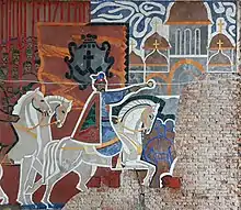 A mosaic is a panoramic, epic composition in spirit. Stark decoration is achieved due to the contrast of little pieces of shiny ceramic tiles, laid on the main compositional lines and contours, and matte colored cement background.[7]