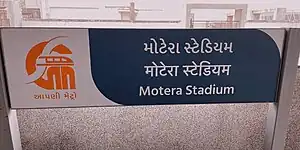 Motera Stadium is the elevated northern terminal metro station on the North-South Corridor of the Red Line of Ahmedabad Metro in Ahmedabad, India, which holds the main Narendra Modi Stadium, the world's largest Cricket stadium in India.[1] This metro station was inaugurated on 30 September 2022 by Prime Minister Narendra Modi and was opened to the public on 6 October 2022.[2][3][4][5]