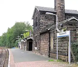 The station and railway here first opened in 1869 for goods and 1870 for passengers, on the line from Northwich to West Cheshire Junction (near Helsby); the extension line from here to Chester was added in November 1874 (1 May 1875 for passengers).[1] At the same time passenger services on the Helsby line, via Manley, ceased and Manley station was closed to passengers, however the line remained open for freight until 1991 and Mouldsworth Junction was managed by a signal box at the end of the platform. Mouldsworth station had a coal yard which opened in March 1871, and from here James Lowe delivered coal to many villages in the local area.[2] The coal yard was in use until at least 1954, as it was listed at that time by the National Coal Board.[3] The coal yard, goods yard (including goods shed), and sidings on both sides of the track were controlled by a second signal box, which went out of use in 1967 and is now in use at Chinnor on the Chinnor and Princes Risborough Railway.