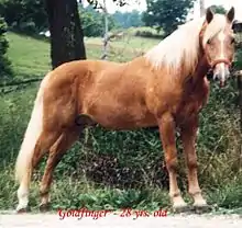 Mountain Pleasure Horses are descendants of the smooth-gaited horses that came to this country with the first settlers. Small, hardy Hobbies, gaited ponies from the British Isles, were used to develop the American Narragansett Pacer.[3] Bred in the New England Colonies during the 17th century, The Narragansett was a fast pacing horse for racing contests. They also performed a smooth ambling gait, sometimes referred to as a “single-footed trot", which made them favorite mounts for traveling between the sparsely settled colonies, especially in rugged terrain.[4][5] The Narragansett Pacer had disappeared from the New England colonies by the early 1800s but the purebred strain of the breed slowly was lost to crossbreeding.[6] Small populations continued to thrive in the Appalachian regions where they were treasured for their smooth gaits, hardiness and sweet dispositions.[3][7] The Narragansett breed did not die out completely until the last-known mare died in 1880.[8]