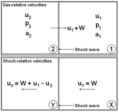 This diagram shows the gas-relative and shock-relative velocities used for the theoretical moving shock equations.