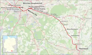 Eurocity (EC) services on the Frankfurt am Main–Salzburg route connect Munich Hauptbahnhof with Salzburg every two hours with stops in Munich East, Rosenheim, Prien, Traunstein and Freilassing. Since the timetable change in 2008, these trains have continued from Salzburg to Graz and Klagenfurt. In addition, an Intercity train pair, branded as the Königssee runs from Hamburg to Berchtesgaden over this line.