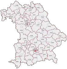 Munich South is located in southern Bavaria. As of the 2021 federal election, it comprises the boroughs of Sendling (6), Sendling-Westpark (7), Obergiesing (17), Untergiesing-Harlaching (18), Thalkirchen-Obersendling-Forstenried-Fürstenried-Solln (19), and Hadern (20) from the independent city of Munich.[1]
