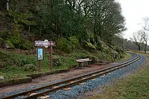 Murthwaite Halt railway station is a small intermediate railway station on the 15" gauge Ravenglass & Eskdale Railway in Cumbria, England.[1] It is named after the (now ruined) farm that stood in the field opposite the railway. The railway serviced the Murthwaite stone crushing plant, built in the 1920s to crush granite from the quarries further up the railway's valley.[2] This was in operation from the 1920s until 1953, and between 1929 and 1953 there was a standard gauge branch from Ravenglass to the crushing plant, the rails being gauntletted either side of the 15" gauge ones.