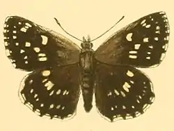 H. gigas Brem. (85 f). Upperside of the wings blackish grey. Size considerable, 48 to 50 mm. Ground of wings black. The white spots small. Female black, with the spots small and but little numerous. The hindwing black, ab. minor ab. nov. has only the size of tessellum and all the spots well developed. From Amurland.[2]