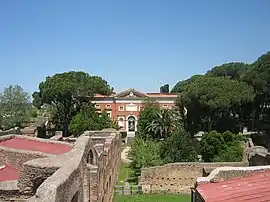The museum was built by Pope Pius IX, who in 1865 had to readapt a fifteenth-century building used as a store to create a city museum. Contained in the museum are numerous archaeological objects which came to light during a long period of excavations. The collection includes, for example, a collection of portraits of famous people from ancient Ostia, including philosophers and members of the royal family, such as busts depicting Asclepius and Volcacius Myropnous,[1] a portrait of Faustina the Elder and the head of Trajan. The museum also has a large collection of sculptures, including the statue of Perseus holding the head of Medusa, the sculptural group of Mithras slaying the bull, and other works. There are other examples on display of great interest, such as small groups in marble depicting Cupid and Psyche and other subjects, and in another section of the museum, sarcophagi and reliefs. On display are also examples of wall paintings from different burials and emblems of polychrome mosaics, such as the Christ Blessing. These works of great historical and artistic value, are then supported by a collection of minor works such as crafts, glass, and even teaches some at the shop, and some interesting facts, such as the marble slab found in the temple of Bellona, on which are carved two pairs of feet opposite, probably a votive object.[2]
