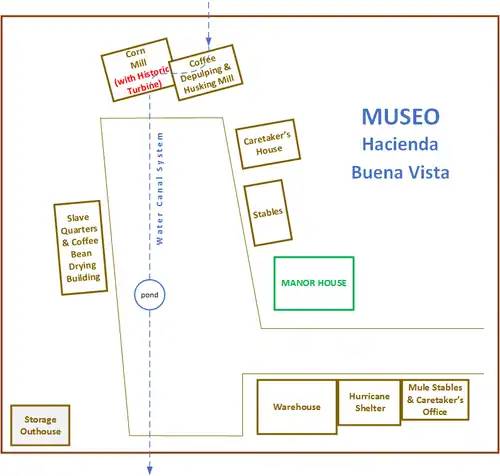 This open-air museum is made up of an 87-acre (350,000 m2) agricultural complex. Its main buildings are grouped together in a 3-acre (12,000 m2) central area and the property includes 11 original buildings: the hacienda manor house, the carriage house, the horse stables, the mule stables, the caretaker's house and office, two warehouses, a hurricane shelter, the corn mill, and the slave quarters. There is a water canal system that is still operative, an aqueduct, and a house garden. The coffee bean processing building was rebuilt to look like the original 1892 building.[20]